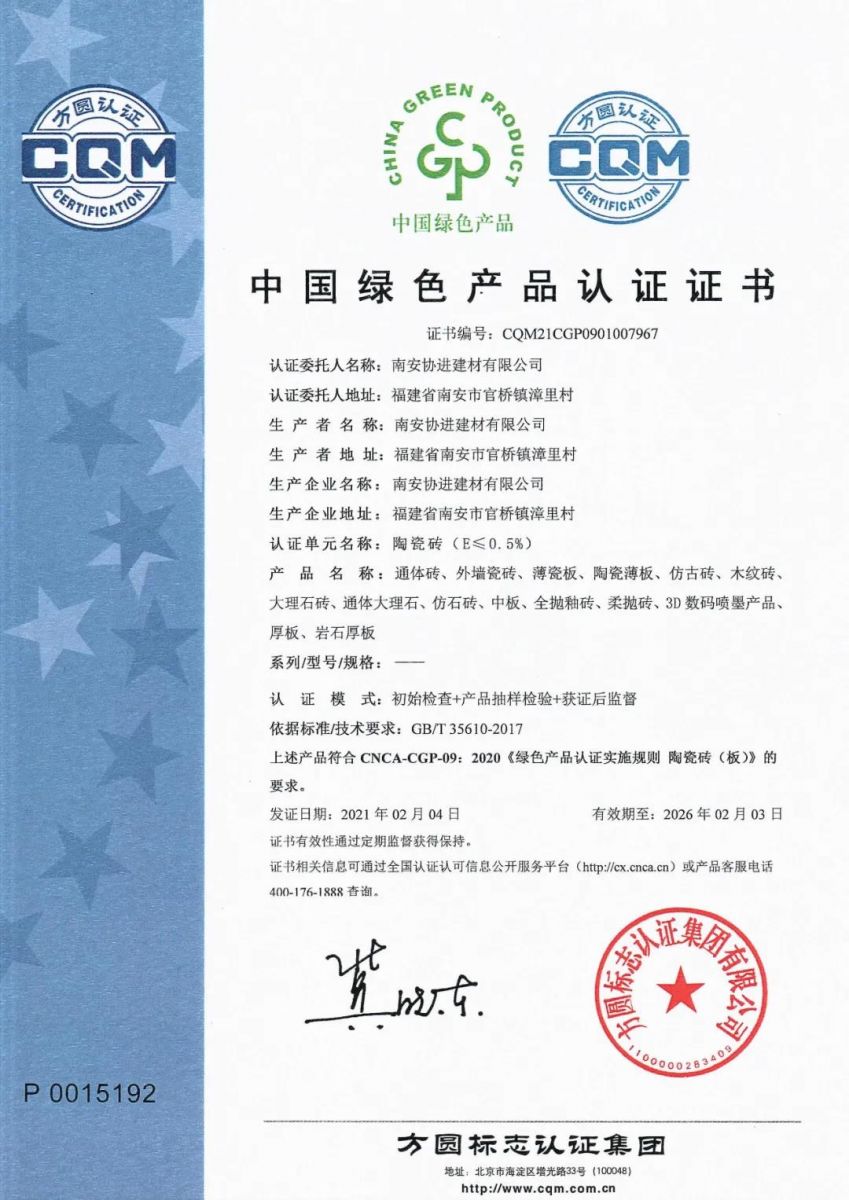 憑借持續踐行“綠色、節能、環保”的發展理念通過“中國綠色產品”認證。是對2012年獲評“全國節能先進集體”、2017年通過“三星級綠色建材評價標識”認證后的鼓勵和再次肯定。協進陶瓷將繼續與社會各界一同攜手構建低碳環保建筑體系,為實現企業與社會的可持續發展繼續努力。